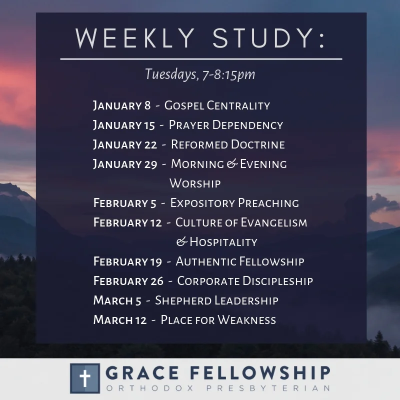 Grace Fellowship OPC will start a new Weekly Study beginning Tuesday, January 8 from 7:00-8:15pm. Currently, we are planning on meeting at our normal location for these studies. Please join us as we go through our ten Core Values and talk more about each of these in detail and about how we seek to live out these values as a church plant!